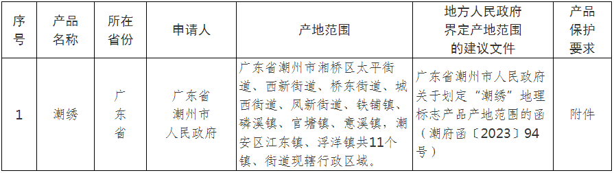 點(diǎn)擊《關(guān)于對(duì)潮繡予以地理標(biāo)志產(chǎn)品初步認(rèn)定的公告》鏈接,了解公告及附件詳情。